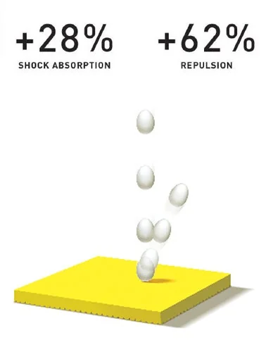 Đệm điện YONEX hấp thụ sốc sau đó đảo ngược năng lượng lại. Để chuyển động trơn tru sang chuyển động tiếp theo. So với urethane, cấu trúc Đệm điện YONEX cung cấp sức mạnh hấp thụ sốc gấp 3 lần. Khi rơi từ độ cao 7m so với tấm Đệm thường. Một quả trứng sẽ bật trở lại 4m mà không bị hư hại.